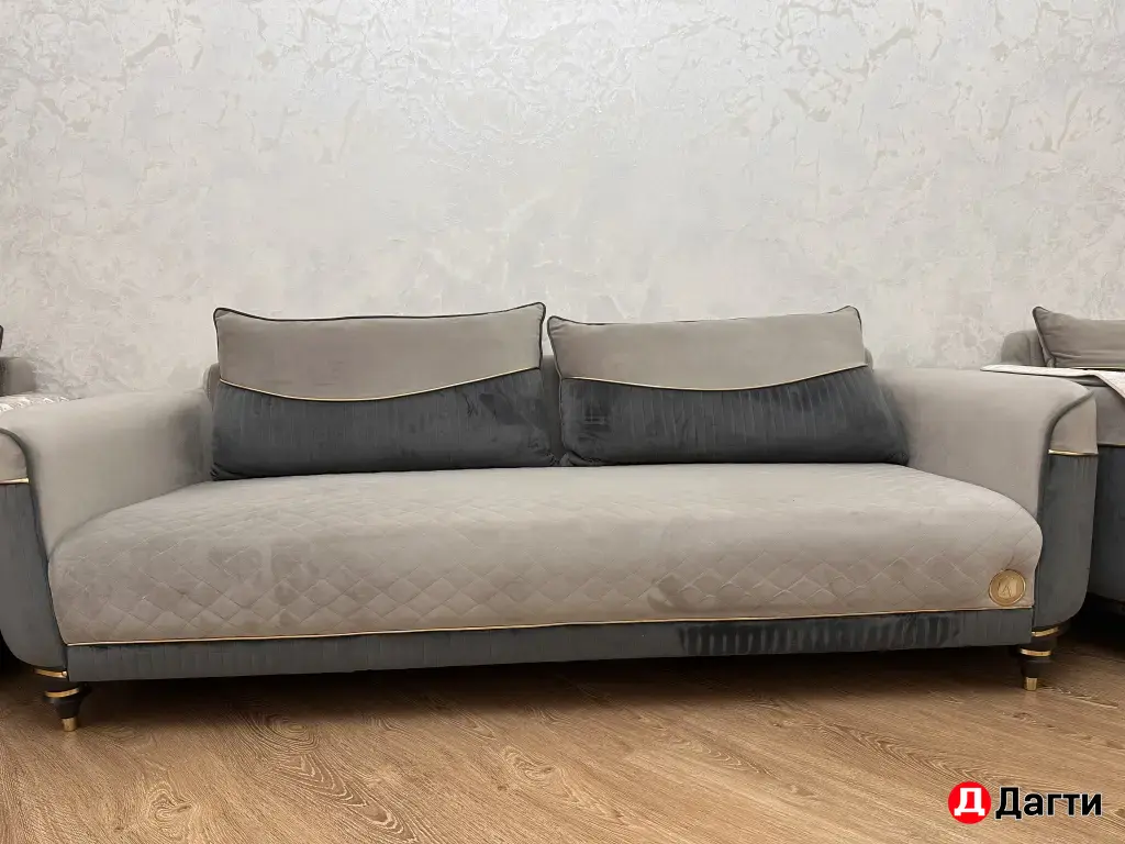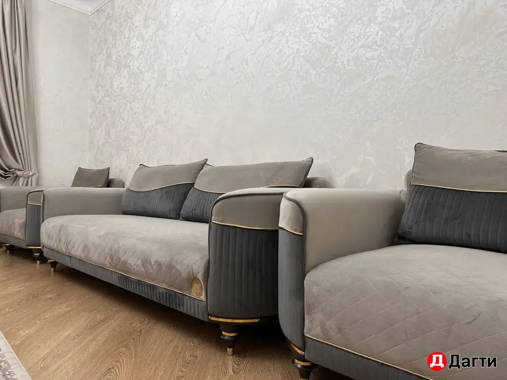 Продается стильный комплект мебели: диван и два кресла. Диван прямой формы, без спального места и раскладного механизма. Его ширина составляет 234 см, глубина - 90 см, высота - 63 см. Обивка серого цвета в отличном состоянии, без пятен и повреждений. Каркас надежный и полностью исправный. В комплекте идут подушки для спинки. Мебель не требует химчистки, выглядит как новая.