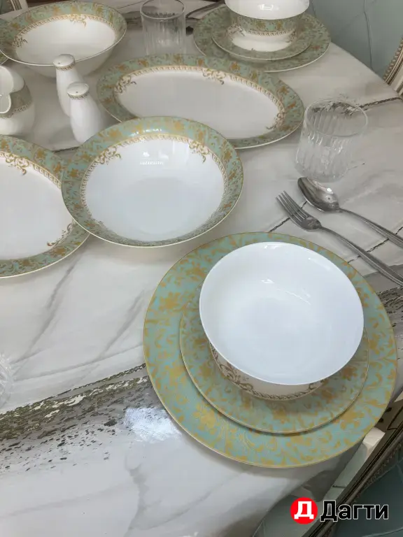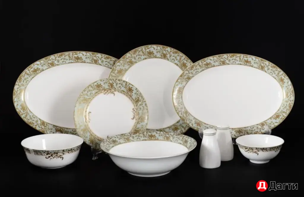 Столовый сервиз в мятно-золотом оттенке — воплощение изысканного вкуса и современной эстетики. Нежный матовый мятный цвет фарфора гармонично сочетается с тонкими позолоченными линиями по краю каждой тарелки. Такой сервиз создаст ощущение свежести и торжественности на любом мероприятии. Он идеально подойдет как для семейных ужинов, так и для особых праздничных приемов. Комплект выполнен из высококачественного прочного фарфора, который гарантирует долговечность. Этот набор станет жемчужиной вашей коллекции и украсит самый изысканный стол. Посуда бренда “Royal”. К сожалению сервиз не в полном составе, перечень: