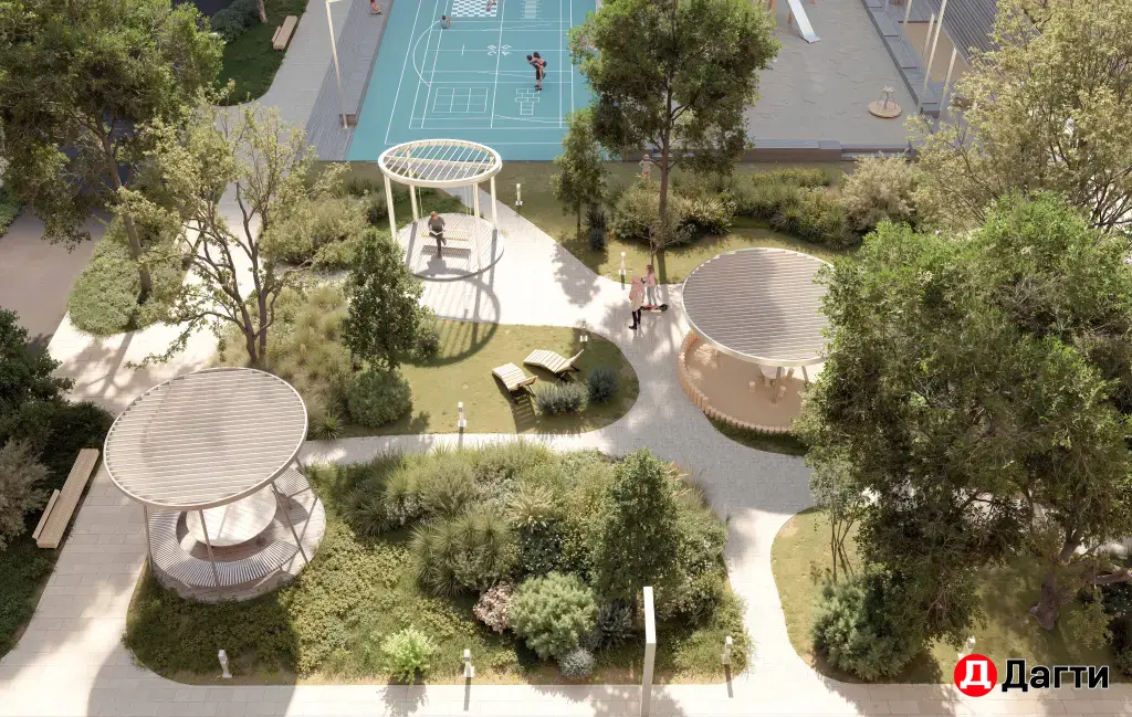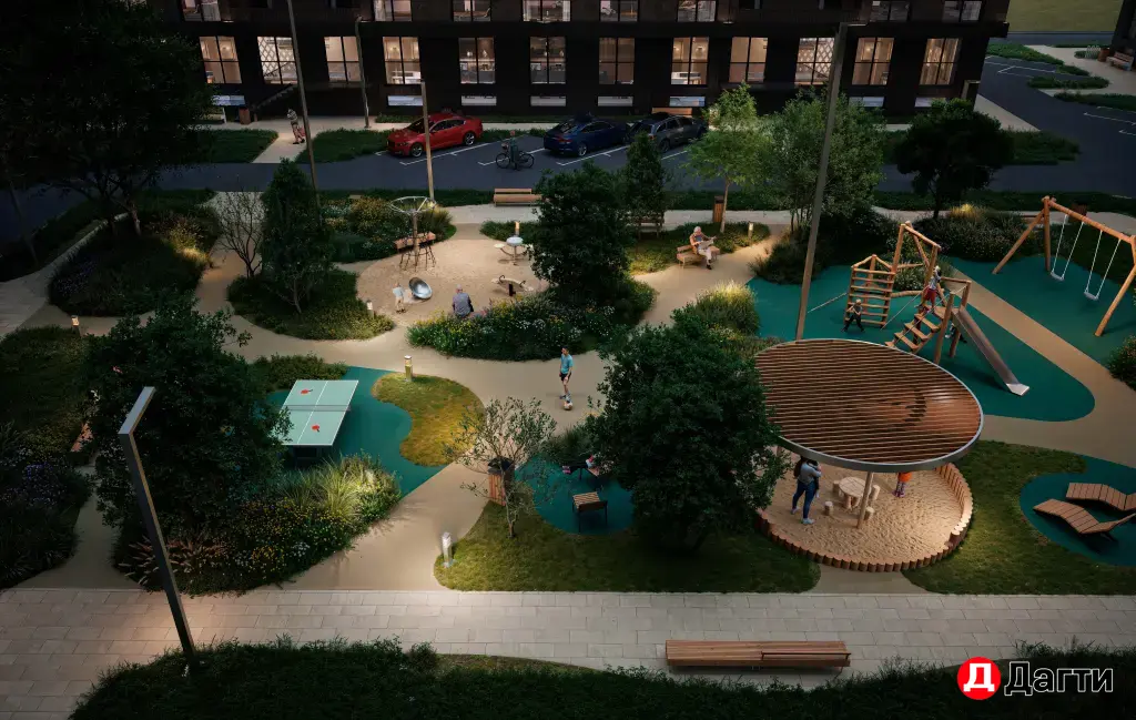 Просторные дворы без машин: благоустроенные территории, детские и спортивные площадки, зоны отдыха, аллеи.